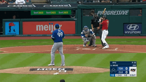 Toronto Blue Jays pitcher Hyun Jin Ryu delivers a pitch during an MLB game against Cleveland.