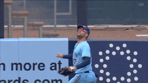 Toronto Blue Jays player Kevin Kiermaier attempts a spectacular wall-climbing catch during an MLB game.