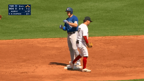 Toronto Blue Jays player Matt Chapman celebrates with a fist pump on base during a game.