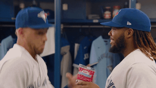 Toronto Blue Jays player George Springer in the dugout, holding a Smuckers Uncrustables sandwich.