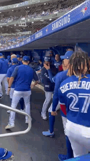 Teoscar Hernandez celebrates a home run with the Toronto Blue Jays, donning the iconic Home Run Jacket in the dugout.