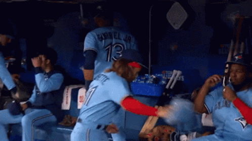 Bo Bichette interacts with Vladimir Guerrero Jr in the Toronto Blue Jays dugout during a baseball game.