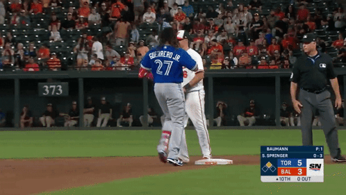 Vladimir Guerrero Jr. celebrates with an emphatic fist pump during a Toronto Blue Jays baseball game.