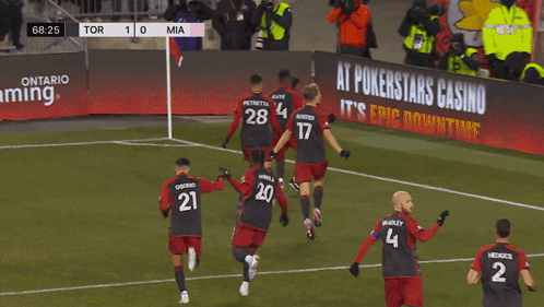 Toronto FC players celebrate a goal, with Mark Anthony Kaye joining the team's joyous moment.