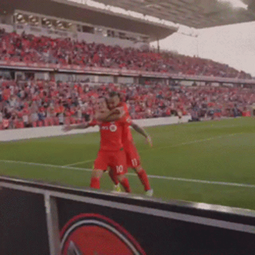 Toronto FC soccer players in red jerseys, numbers 10 and 11, celebrate a goal with a hug on the field.