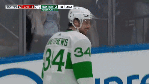 Auston Matthews celebrates a goal for the Toronto Maple Leafs in their St. Pats themed jersey during an NHL game.