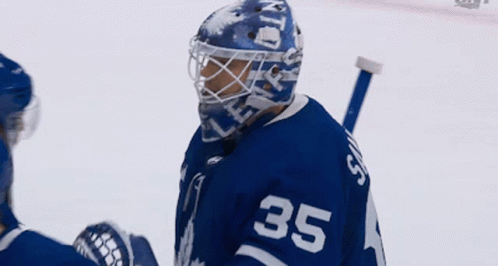 Ilya Samsonov and Zach Aston Reese of the Toronto Maple Leafs share a moment on the ice.