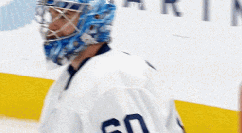 Toronto Maple Leafs goalie Joseph Woll gets a celebratory hug from a teammate on the ice after a win.