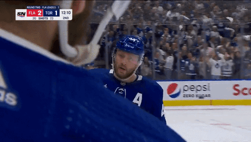 Morgan Rielly, #44 for the Toronto Maple Leafs, on the ice during a hockey game.