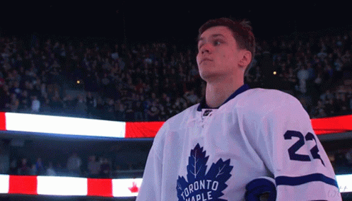 Nikita Zaitsev, a Toronto Maple Leafs hockey player, stands on the ice in his white jersey, looking up at the crowd.