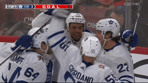 a group of hockey players are celebrating a goal in a game sponsored by tsn