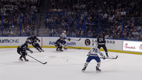 a hockey game is being played in a stadium with nhl on the bottom left