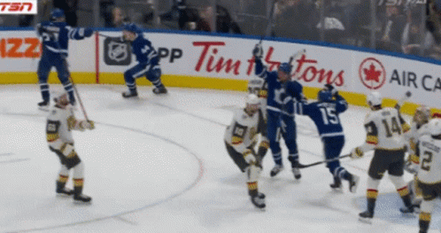 Toronto Maple Leafs players Timothy Liljegren and Mitch Marner celebrate a goal on the ice during a hockey game.