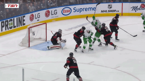 Zach Aston Reese of the Toronto Maple Leafs scores a goal in a fast-paced hockey game.