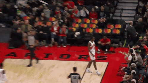 a basketball player stands on a court with the word raptors written on it