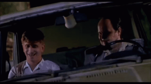 Two men from the film Torrente are in a car, one laughing at the other's reaction.