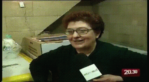 A woman with glasses smiles while holding a microphone, discussing 'Lo torrone' (nougat) in an Italian context.