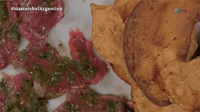 Preparing a Tostitos Cueros snack, adding various shredded toppings and a generous amount of red sauce to a bag of chips.