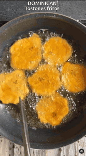 Dominican tostones fritos, or fried plantains, sizzling in hot oil in a pan, being flipped with tongs.