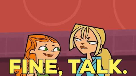 Total Drama Action's Bridgette and Izzy are shown with the caption 'FINE, TALK.' in this animated clip.