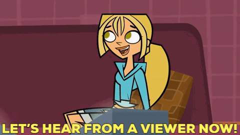 Bridgette from Total Drama Action, with on-screen text 'LET'S HEAR FROM A VIEWER NOW!'.
