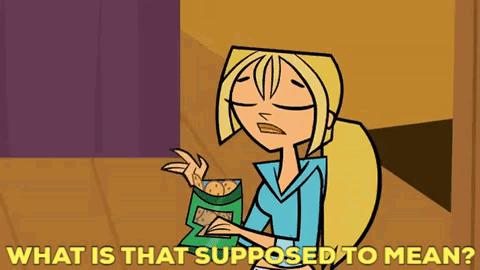 Bridgette from Total Drama Island holds a bag of chips, questioning, 'What is that supposed to mean?'