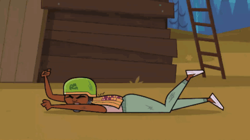 Nichelle from Total Drama Island lies on the ground, appearing distressed and crying, wearing a green helmet.