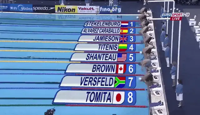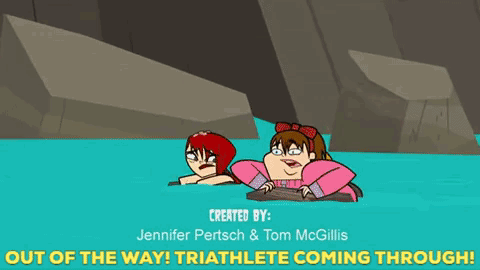 Total Drama's Jo makes a splash, declaring 'Out of the way! Triathlete coming through!' while swimming.