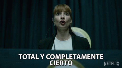 Alicia Sierra from La Casa de Papel speaks behind a podium, with the phrase 'Totally and Completely True' displayed.