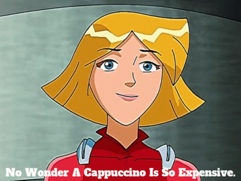 Clover from Totally Spies humorously comments on the high cost of cappuccino, reflecting on its expense.