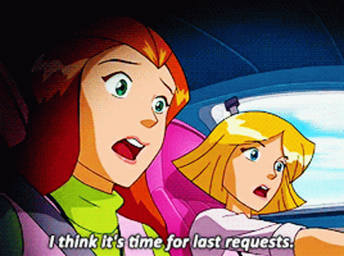 Sam from Totally Spies, with Clover, says 'I think it's time for last requests' in a car.