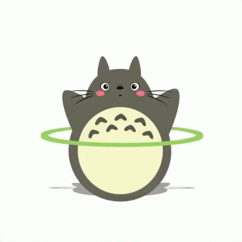 Totoro, the beloved forest spirit, playfully hula-hooping with a vibrant green hoop around his waist.