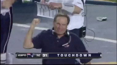 A man celebrates a touchdown in an NFL game, with the scoreboard displaying 'Touchdown'.