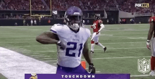 Minnesota Vikings player #21 celebrates a touchdown with a dance on the football field.