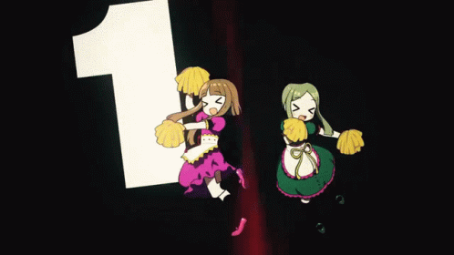 Two anime cheerleaders, likely Touhou characters Mai and Satono, perform a lively dance with pom-poms.