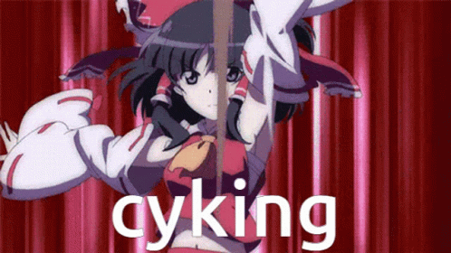 Reimu Hakurei from Touhou Project in an energetic pose with 'cyking' text on a red background.