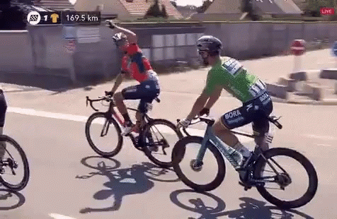Cyclists Peter Sagan and Vincenzo Nibali share a high-five during the Tour de France race.