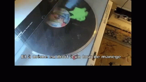 A record player spinning with a small green turtle toy, Lulu la Tortue, on it, like a carousel ride.