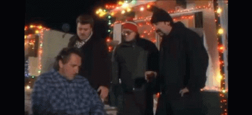 Ricky, Julian, Bubbles, and Jim Lahey gather for Christmas festivities outside a decorated house.