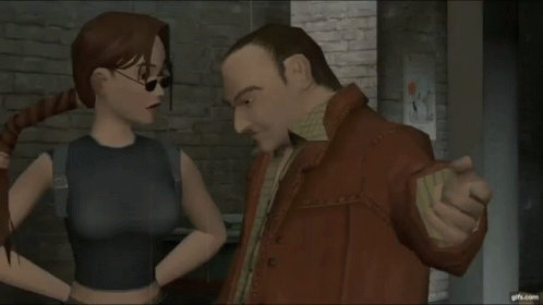 Lara Croft interacts with a man in a red jacket in a cutscene from Tomb Raider: Angel of Darkness.