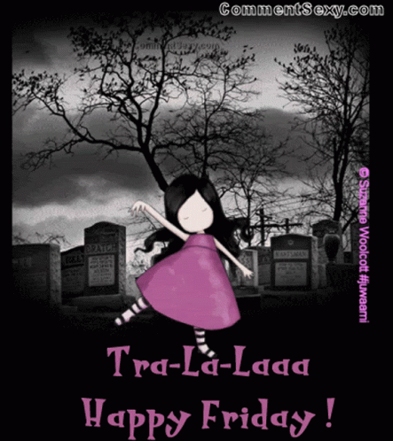 A cartoon girl in a purple dress dances in a spooky cemetery, celebrating with 'Tra-La-Laaa Happy Friday!'