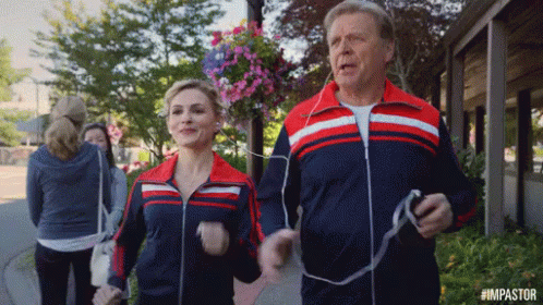A man and a woman in matching tracksuits enjoy a brisk morning walk, featured with the hashtag #Impastor.