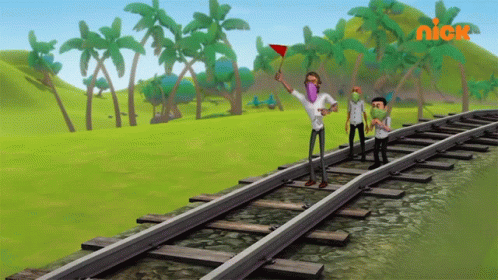 Chingam, Mansi, and Akash face danger on train tracks as a train approaches in this animated scene.
