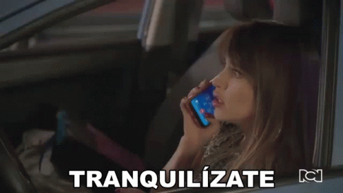 Ingrid from Lalas Spa on the phone in a car, being told to 'Calm down' (Tranquilízate).