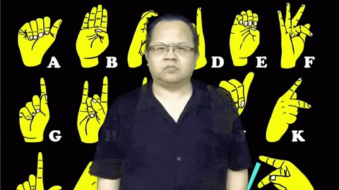 Man demonstrates the LSF sign for 'Tranquille' (calm/peaceful) in front of an alphabet chart.