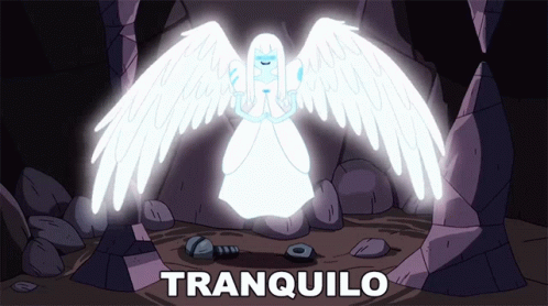 An angel-like character from Hora De Aventura glows in a cave, with 'TRANQUILO' displayed below.