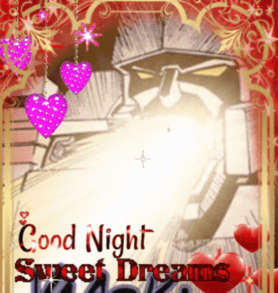 Megatron from Transformers featured in a 'Good Night Sweet Dreams' greeting card with hearts.