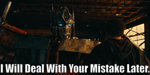 Optimus Prime from Transformers delivers a stern warning, stating 'I will deal with your mistake later' to a human.