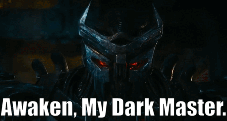 Scourge from Transformers: Rise of the Beasts, with the caption 'Awaken, My Dark Master'.