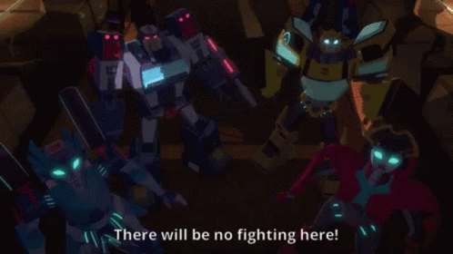 A Transformer declares 'There will be no fighting here!' to other robots in a dark setting.